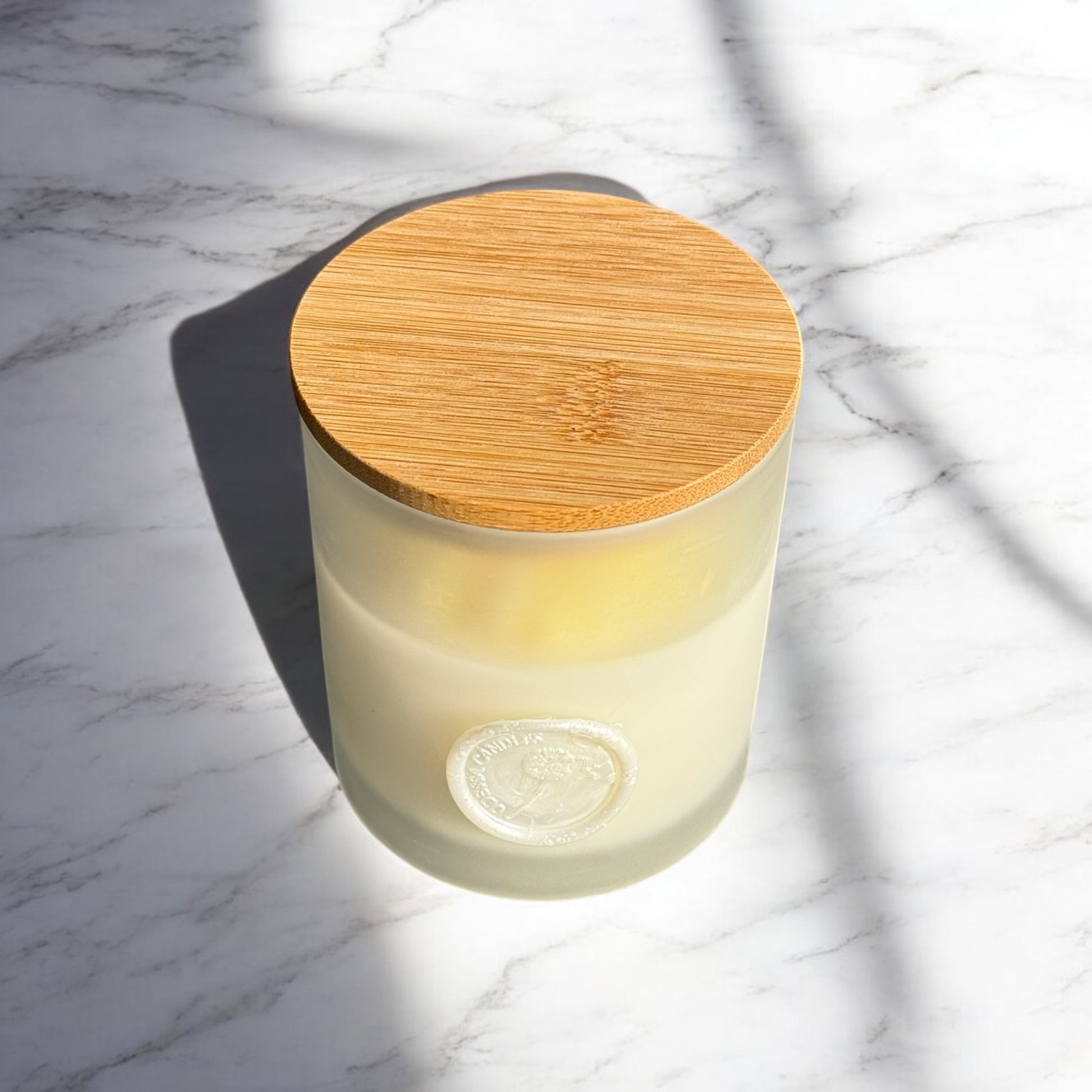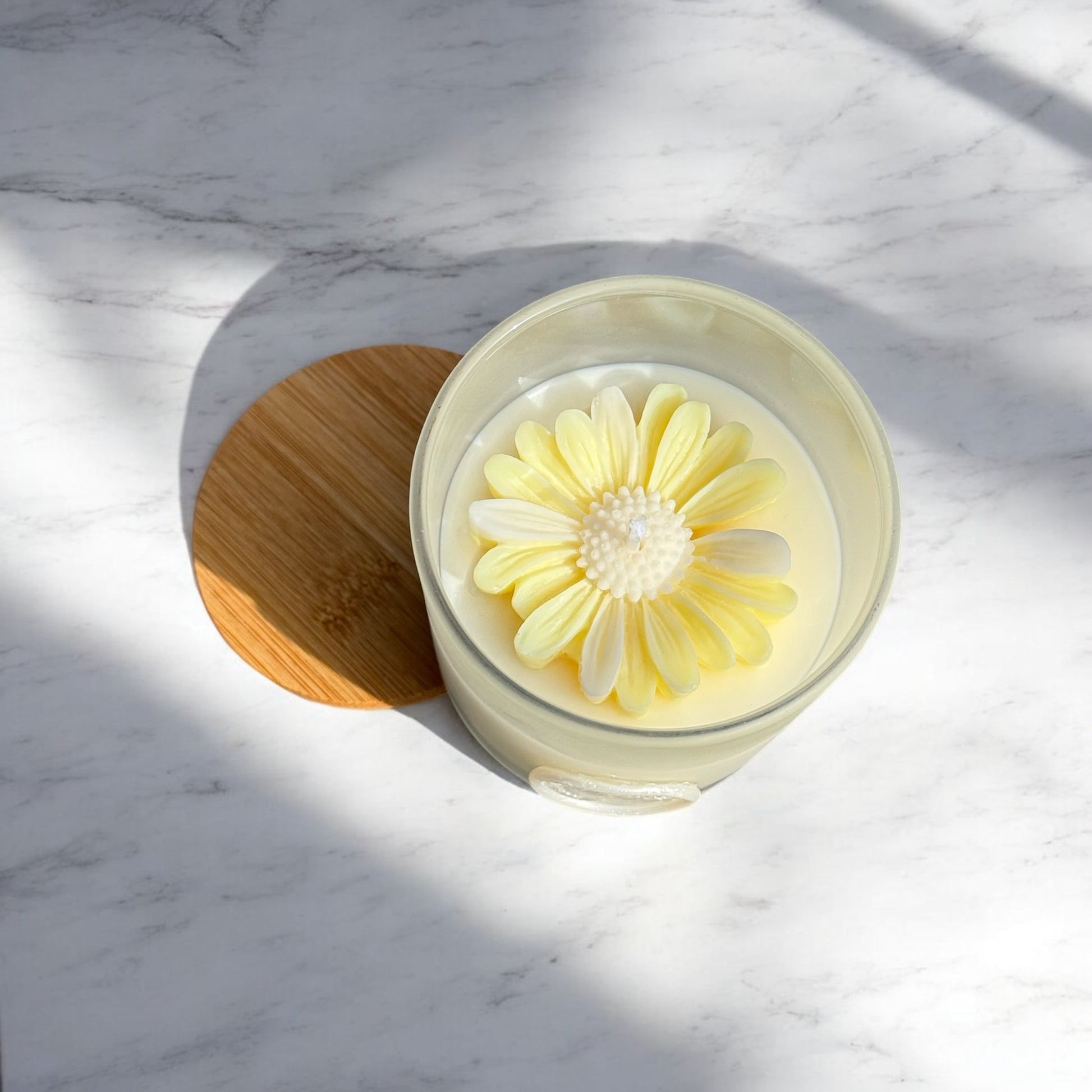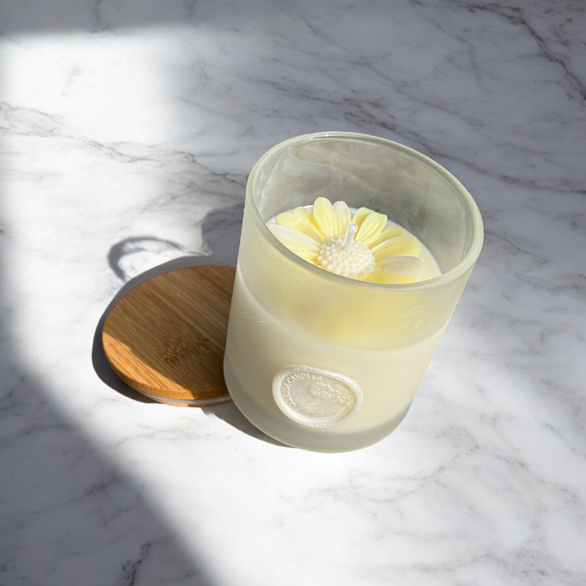 Marguerite Glass, a handcrafted soy wax candle inspired by the elegance of marguerite flowers. Nestled within a smooth wax base, the intricately sculpted bloom brings a touch of nature’s beauty to your home.