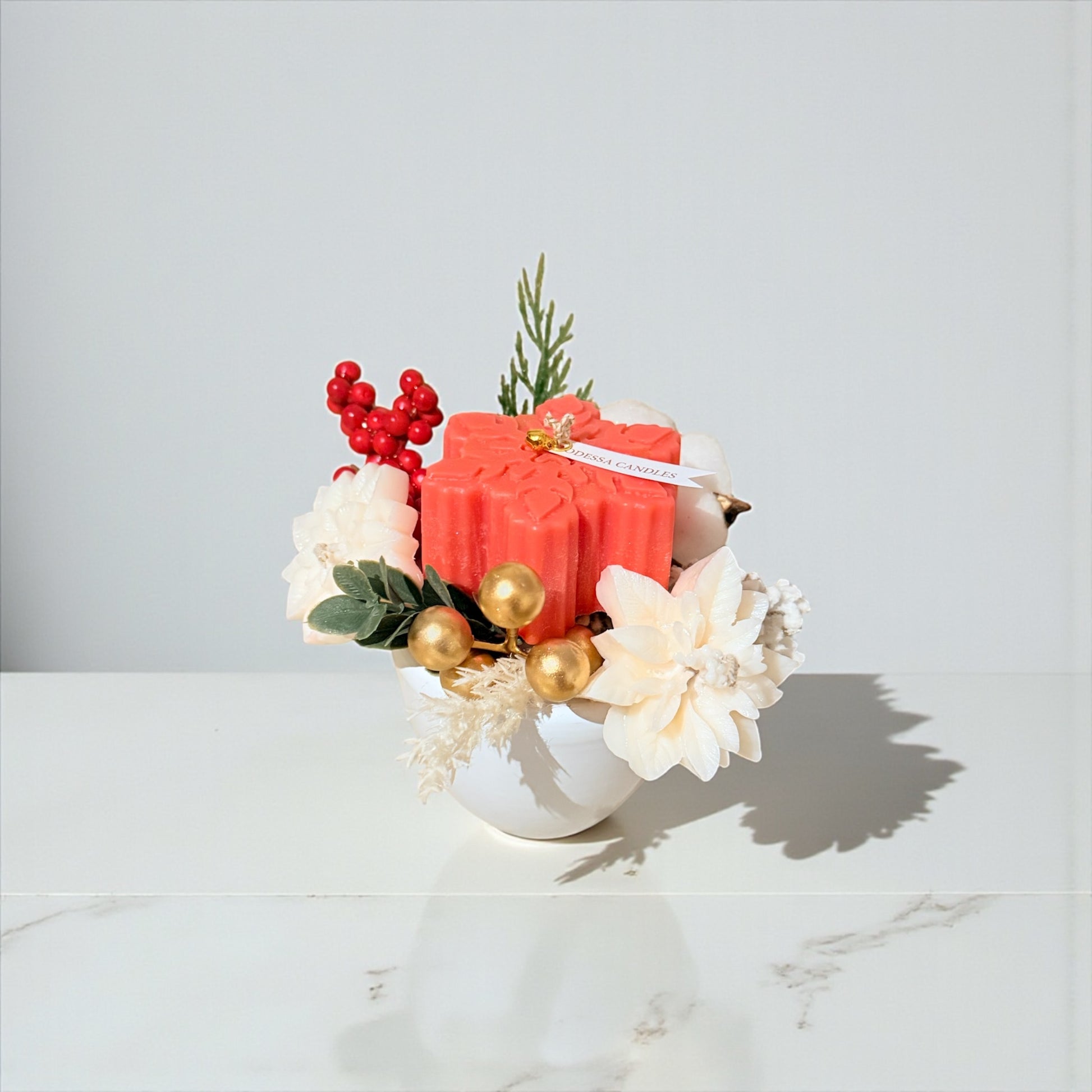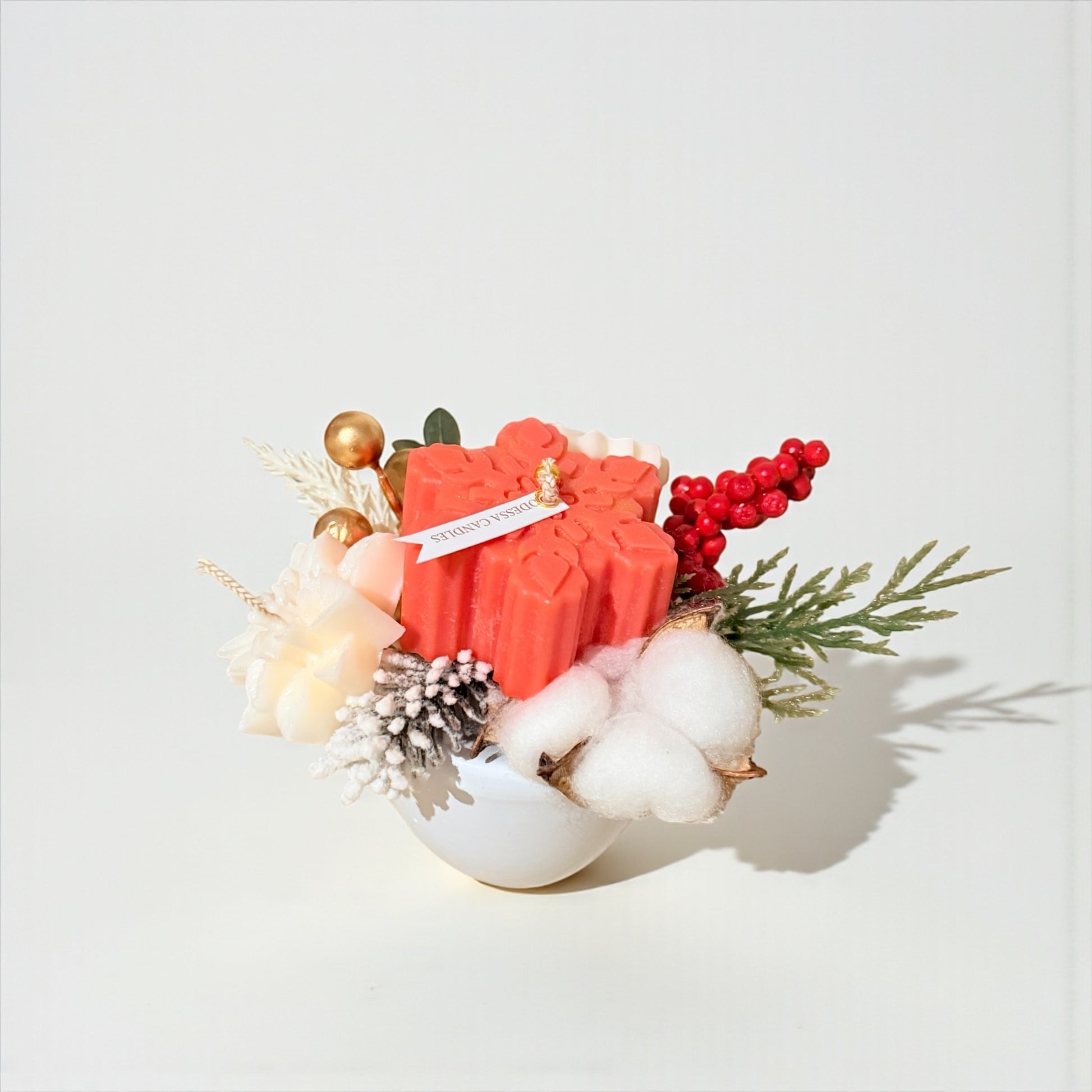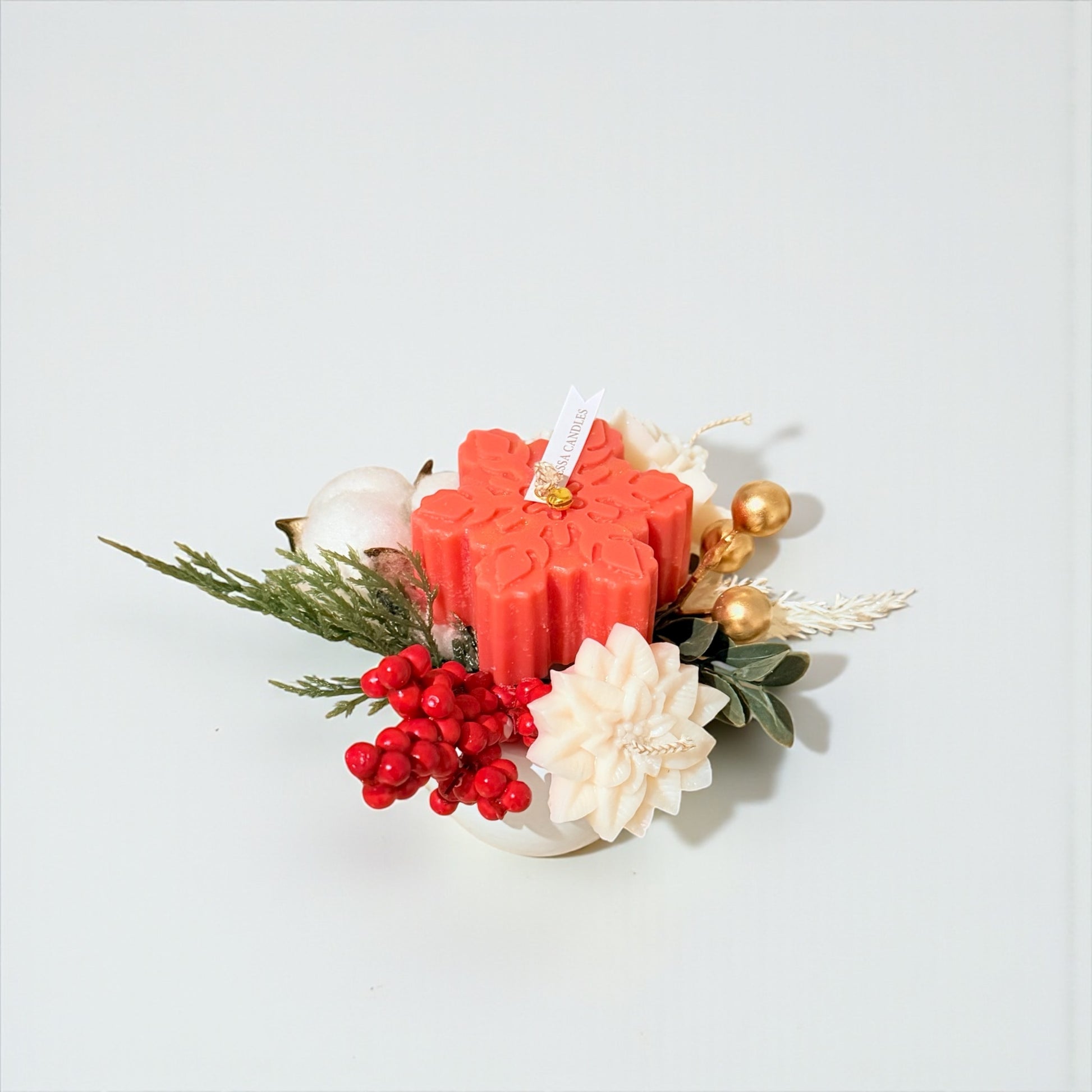 A festive winter arrangement featuring a hand-poured soy wax snowflake candle in rich crimson tones, surrounded by delicate ivory wax florals, soft cotton accents, frosted berries, and evergreen sprigs.
