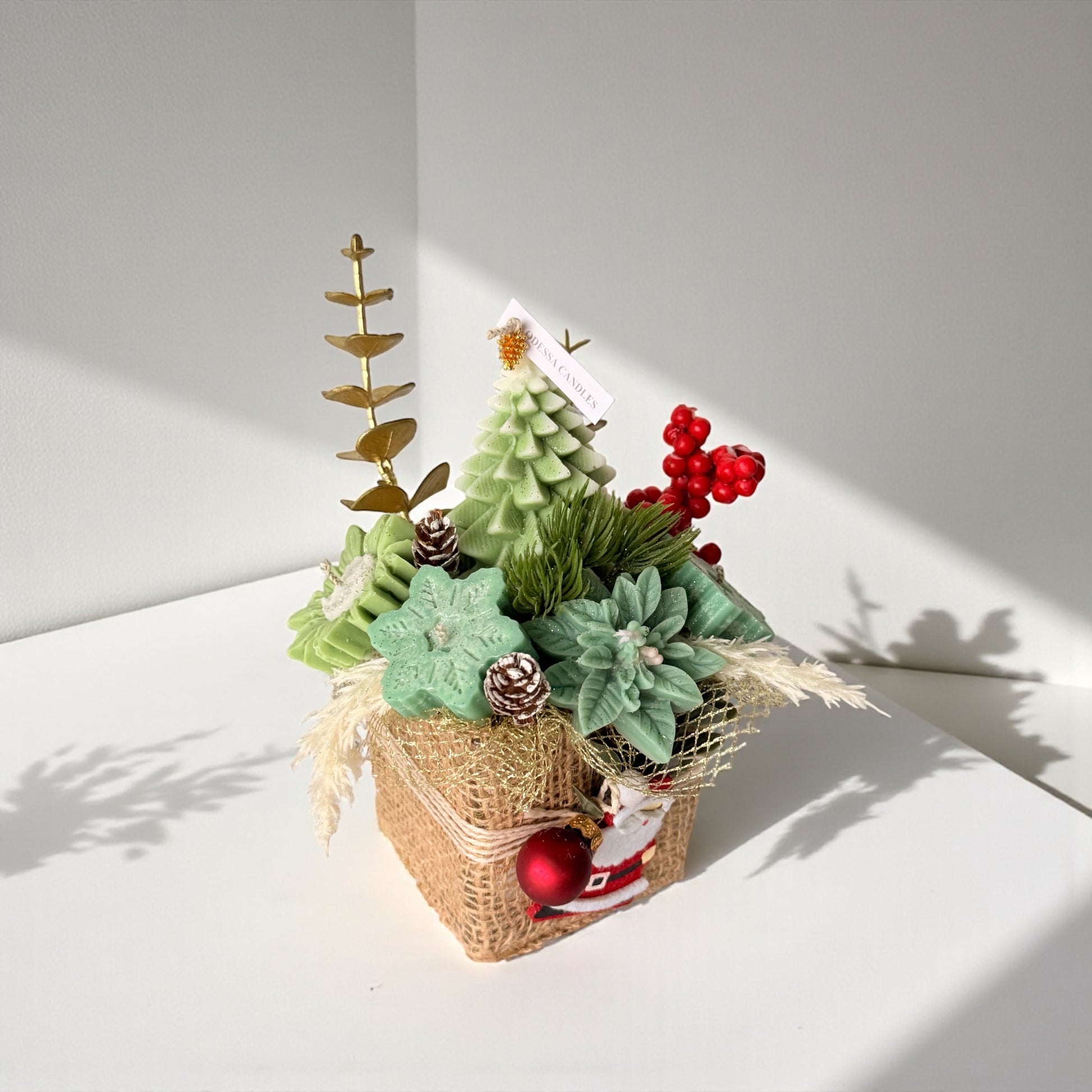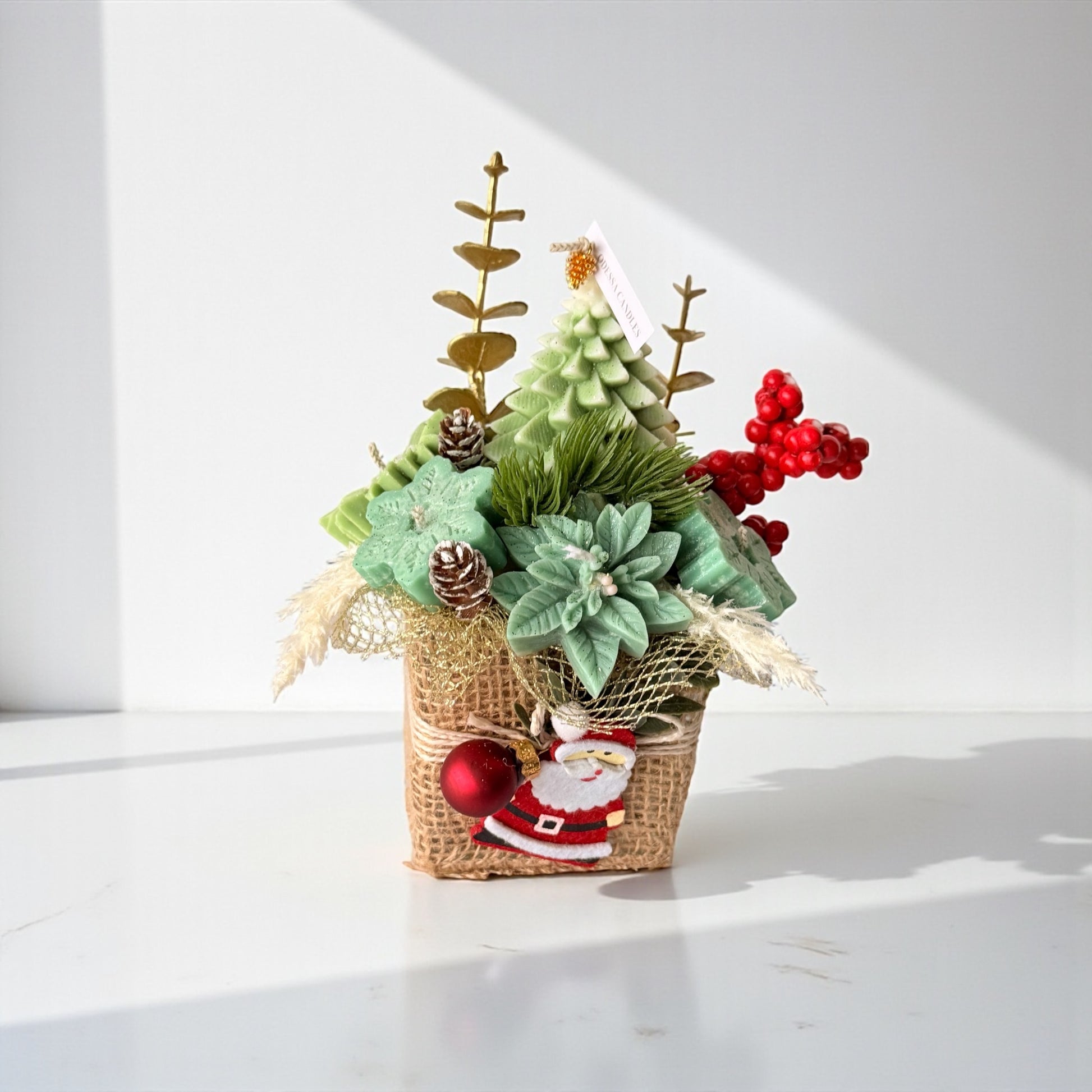 Evergreen Delight, a festive winter arrangement featuring hand-poured soy wax evergreens, florals, and seasonal accents, bringing a cheerful touch of Christmas magic to any space.
