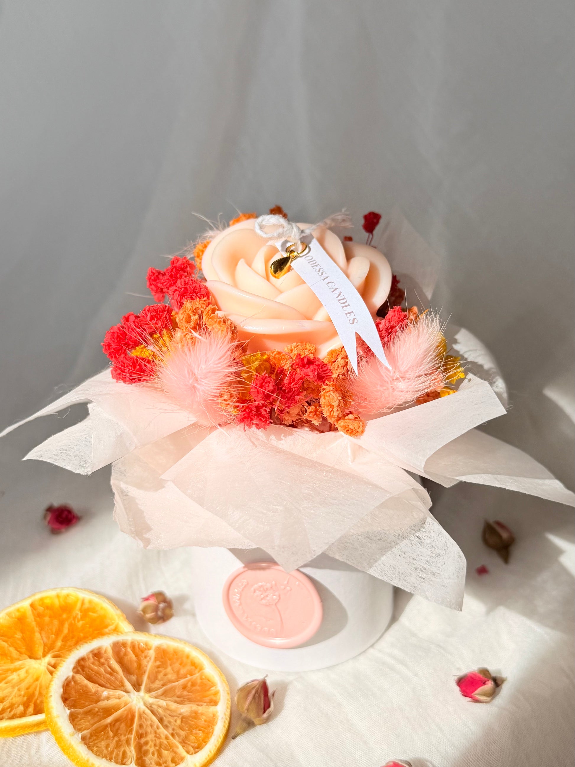 A radiant handcrafted soy wax flower candle, designed with a soft peach rose at its heart and surrounded by vibrant dried blooms in warm shades of pink, orange, and red. This elegant piece embodies warmth, joy, and tenderness—perfect for brightening any interior or gifting a touch of refined beauty.