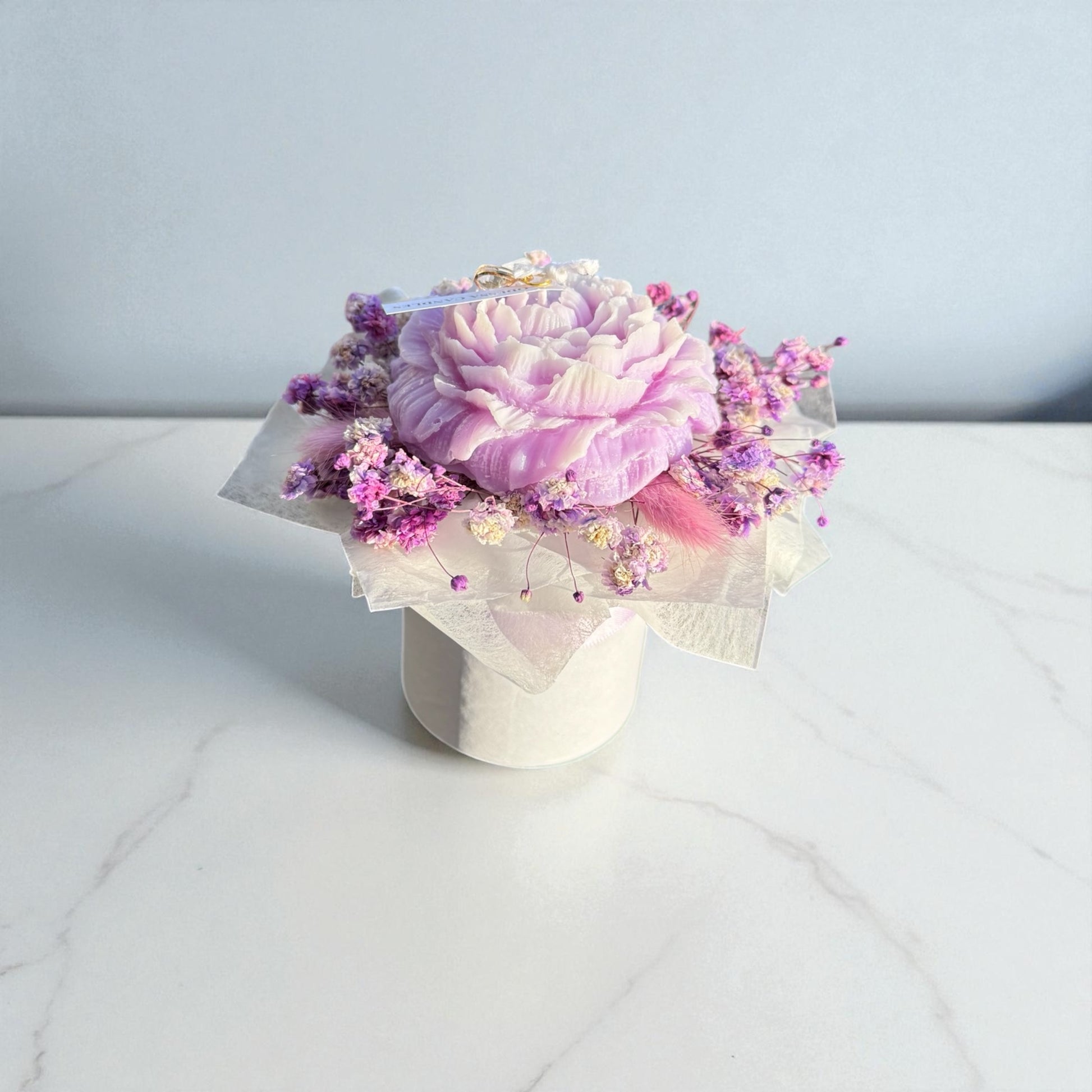 Featuring a meticulously sculpted lilac peony candle surrounded by soft pastel dried florals, it harmoniously combines delicate hues with artisanal craftsmanship to create a timeless decorative piece.