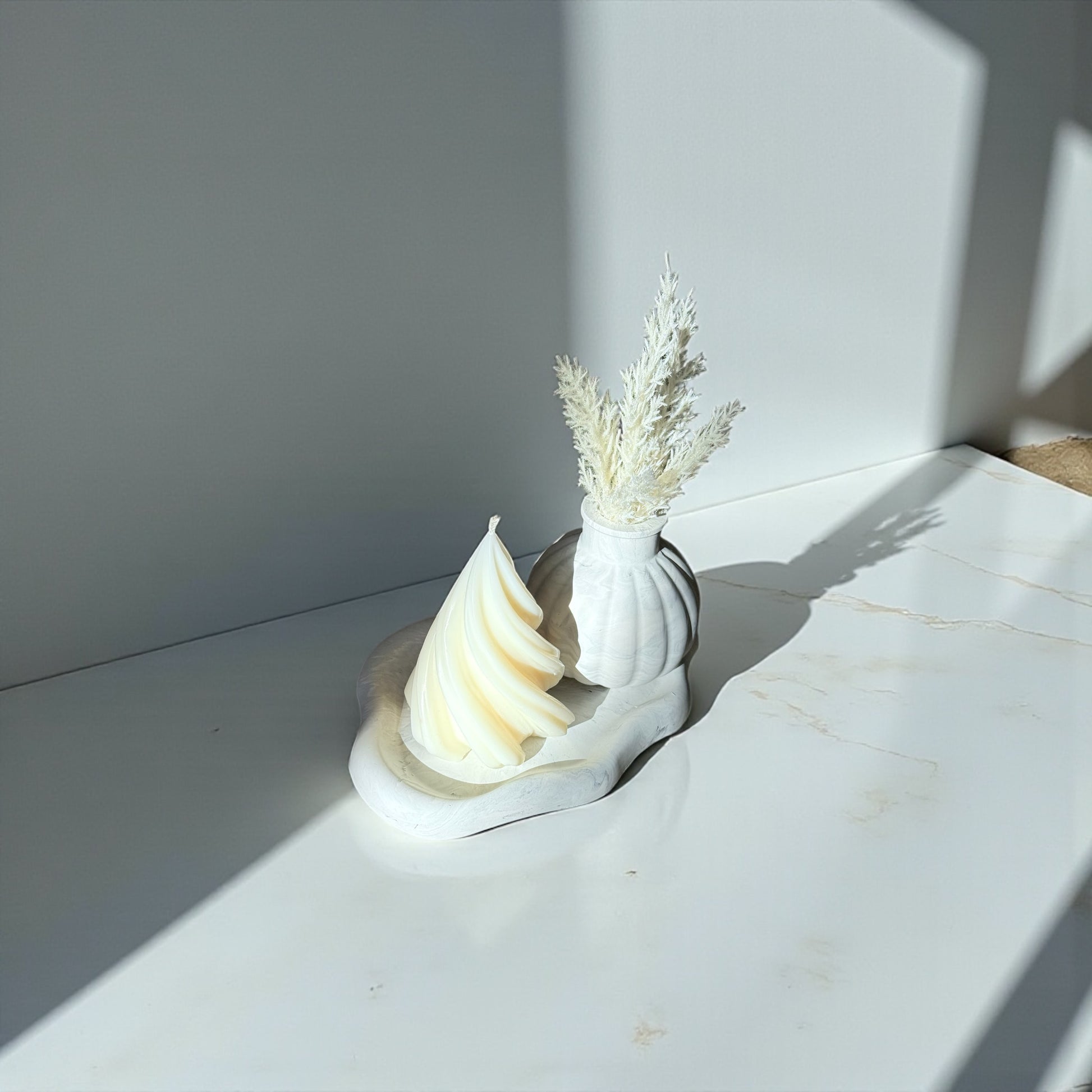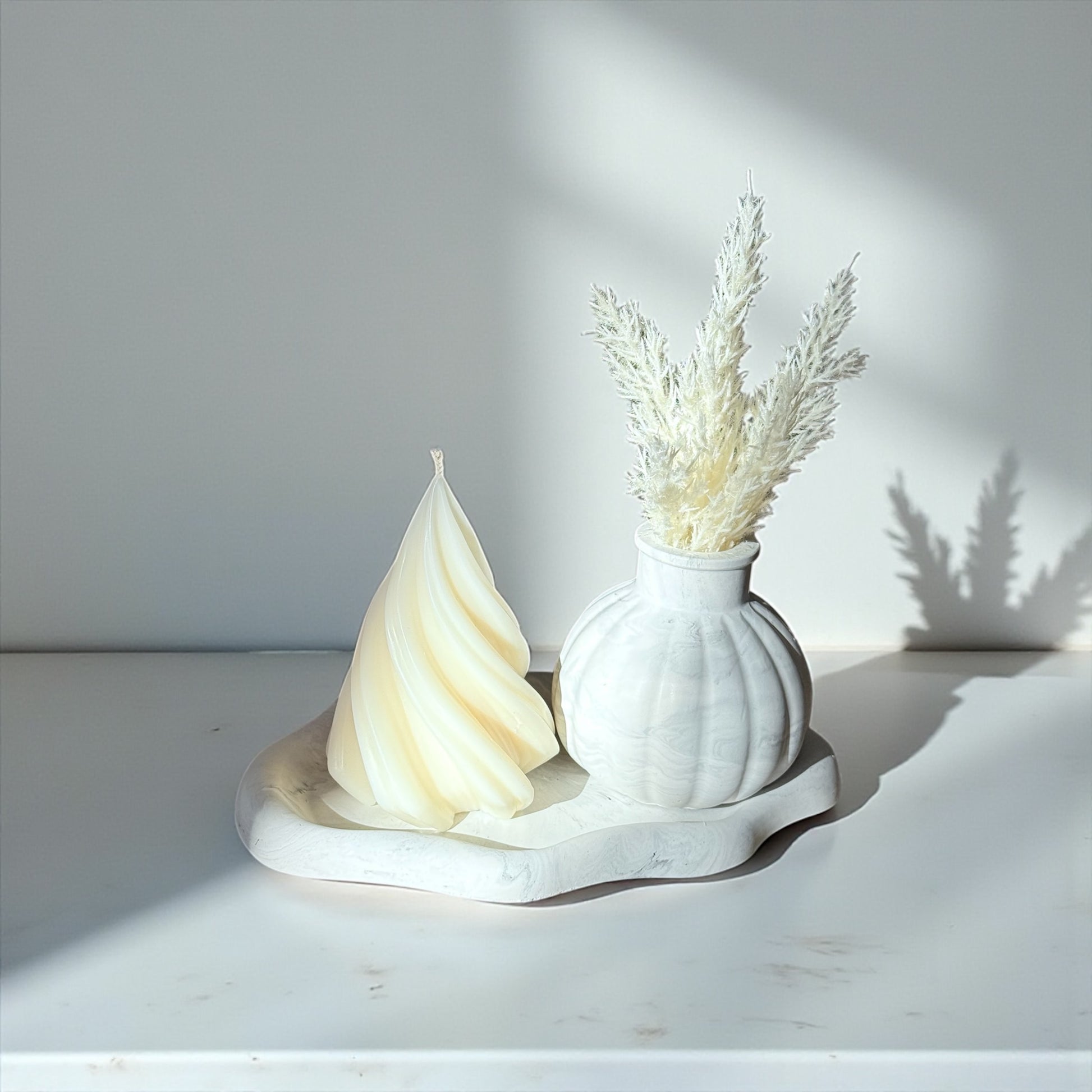 Bring a touch of winter elegance into your home with Winter Marble Forest. This unique candle features a sculpted pine tree in creamy white soy wax, placed on a sleek Jesmonite tray with a striking black-and-grey marble effect. A matching Jesmonite vase holds delicate white dried flowers, completing this sophisticated seasonal display. Perfect as a centerpiece or a thoughtful gift, it blends minimalist luxury with cozy, festive charm.