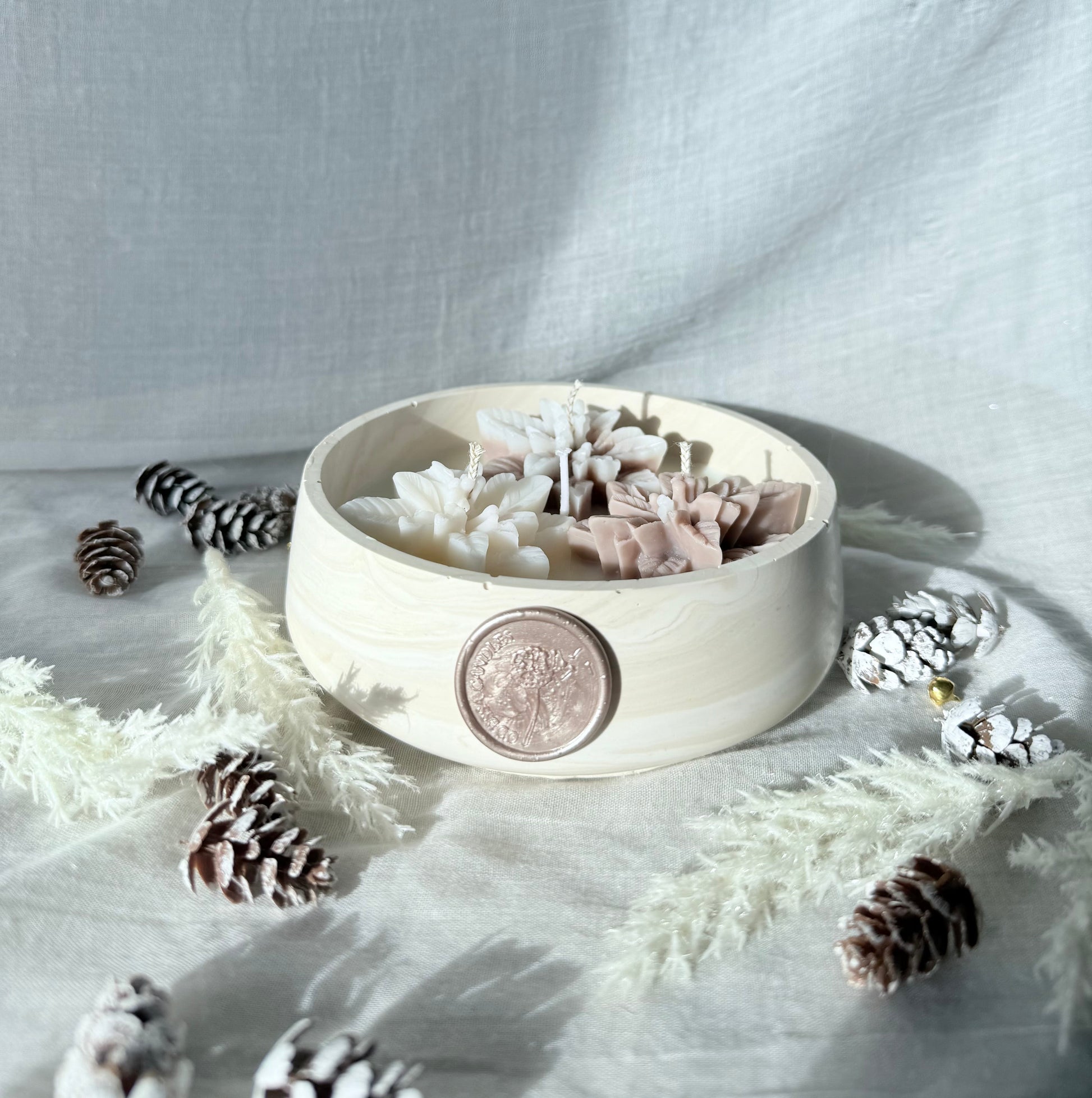 Introducing the Winter Petal Bowl, a delicate hand-cast jesmonite vessel filled with creamy soy wax and adorned with three sculpted floral candles in soft winter tones ivory snow and warm cocoa bloom.